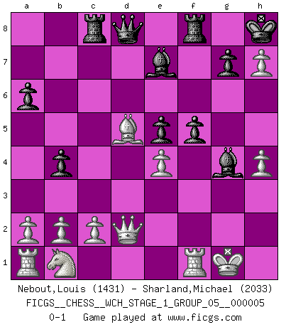 Last move : 0-1 2008 September 3 23:58:52 [Event "FICGS__CHESS__WCH_STAGE_1_GROUP_05__000005"] [Site "FICGS"] [Date "2008.07.08"] [Round "1"] [White "Nebout,Louis"] [Black "Sharland,Michael"] [Result "0-1"] [WhiteElo "1431"] [BlackElo "2033"] 1.e4 c5 2.Nf3 d6 3.d4 cxd4 4.Nxd4 Nf6 5.Nc3 a6 6.Be2 e6 7.O-O Be7 8.f4 O-O 9.Be3 Nc6 10.g4 Nxd4 11.Bxd4 b5 12.g5 Nd7 13.h4 b4 14.Nb1 e5 15.Be3 exf4 16.Bxf4 f6 17.Bc4+ Kh8 18.g6 Ne5 19.Bd5 Bg4 20.Qd2 Rc8 21.Bxe5 dxe5 22.gxh7 f5 0-1 Sicilian : Najdorf, Opovcensky variation Kingside Castling by player White (move 7) Kingside Castling by player Black (move 8) Player Black won this chess game. Follow this game move after move (download)I feel as if I were a piece in a game of Chess, when my opponent says of it: That piece cannot be moved. (Soren Kierkegaard) Ich tröste mich mit dem Vergnügen, daß Schachfans, Zuschauer und Leser glücklich sind, wenn ein Großmeister etwas riskiert, statt nur Klötzchen zu schieben. (Mikhail Nekhemyevich Tal) Solo puedes ser bueno en el Ajedrez si amas al juego. (Bobby Fischer) La vie et les Echecs sont tous les deux une lutte constante. (Lasker) Perseverance does not equal worthiness. Next time you want to get my attention, wear something fun. Low-riding jeans are hot. (Gregory House, House M.D.)