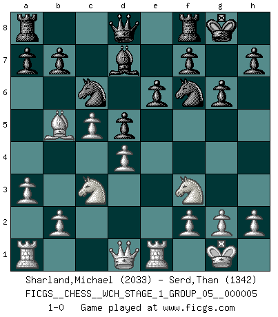 Last move : 1-0 2008 September 11 21:35:46 [Event "FICGS__CHESS__WCH_STAGE_1_GROUP_05__000005"] [Site "FICGS"] [Date "2008.07.08"] [Round "1"] [White "Sharland,Michael"] [Black "Serd,Than"] [Result "1-0"] [WhiteElo "2033"] [BlackElo "1342"] 1.e4 c6 2.d4 d5 3.exd5 cxd5 4.c4 e6 5.Nc3 Nf6 6.c5 Nc6 7.Bb5 g6 8.Nf3 Bg7 9.Bf4 O-O 10.Bd6 Re8 11.O-O Bd7 12.Re1 Bf8 13.Bxf8 Rxf8 14.a3 1-0 This chess game has been lost on time (started : 2008.07.08 16:18:31) Caro-Kann : Panov-Botvinnik attack Kingside Castling by player Black (move 9) Kingside Castling by player White (move 11) Player White won this chess game. Follow this game move after move (download)It is no time to be playing Chess when the house is on fire. (Italian Proverb) Ich hatte Zahnschmerzen im ersten Spiel. In der zweiten Partie tat mir der Kopf weh. In der dritten war es eine Rheuma-Attacke und während der vierten fühlte ich mich nicht gut. Und in der fünften? Nun, man muss doch nicht jedes Spiel gewinnen, oder? (Savielly Grigorievitsch Tartakower) Si el Ajedrez es una ciencia, es la mas inexacta. Si el Ajedrez es un arte, es demasiado inexacto para ser visto como tal. Si el Ajedrez es un deporte, es demasiado esotérico. Si el Ajedrez es un juego, es demasiado exigente para ser solo un juego. Si el Ajedrez es una aventura, es una muy demandante. Si el Ajedrez es una pasión, es una muy gratificante. Si el Ajedrez es la vida, es una muy triste. (Anónimo) Le profane ne songe pas à la somme de jouissance dont il se prive, qui méconnaît ce jeu aux ressources aussi variées que passionnantes. (Jean-Marie Jeanton-Lamarche) A specialist learns more and more about less and less until he knows everything about nothing. (Nicholas Murray Butler)
