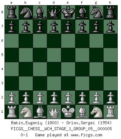 Last move : 0-1 2008 August 7 17:16:17 [Event "FICGS__CHESS__WCH_STAGE_1_GROUP_05__000005"] [Site "FICGS"] [Date "2008.07.08"] [Round "1"] [White "Bakin,Eugeniy"] [Black "Orlov,Vladimir"] [Result "0-1"] [WhiteElo "1800"] [BlackElo "1954"] 0-1 This chess game has been lost on time (started : 2008.07.08 16:18:31) Player Black won this chess game. Follow this game move after move (download)Chess is a sea in which a gnat may drink and an elephant may bathe. (Hindu proverb) Ich rechne überhaupt nicht voraus. Ich gewinne auch so. (Robert James Fischer) Las ideas audaces son como las piezas del Ajedrez que avanzan hacia adelante. Ellas pueden ser vencidas, pero también pueden iniciar una partida victoriosa. (Goethe) Psychologiquement, tu dois avoir confiance en toi même, mais cette confiance doit être basée sur des faits. (Robert Fischer) Perhaps the current trend of many chess professionals taking up the more lucrative pastime of poker is not a wholly negative one. It may not be too late for humans to relearn how to take risks in order to innovate and thereby maintain the advanced lifestyles we enjoy. And if it takes a poker-playing supercomputer to remind us that we can't enjoy the rewards without taking the risks, so be it. (The Chess Master and the Computer, by Garry Kasparov - 2010)