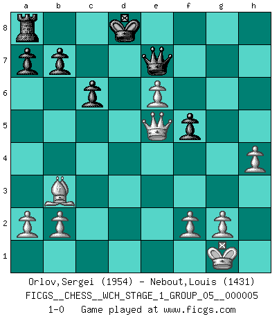 Last move : 1-0 2008 October 23 21:53:11 [Event "FICGS__CHESS__WCH_STAGE_1_GROUP_05__000005"] [Site "FICGS"] [Date "2008.07.08"] [Round "1"] [White "Orlov,Vladimir"] [Black "Nebout,Louis"] [Result "1-0"] [WhiteElo "1954"] [BlackElo "1431"] 1.e4 e5 2.Nf3 Nc6 3.Bc4 Bc5 4.c3 Nf6 5.d4 exd4 6.cxd4 Bb4+ 7.Nc3 Nxe4 8.O-O Bxc3 9.d5 Bf6 10.Re1 Ne7 11.Rxe4 d6 12.Bg5 Bxg5 13.Nxg5 O-O 14.Nxh7 Kxh7 15.Qh5+ Kg8 16.Rh4 f5 17.Qh7+ Kf7 18.Rh6 Rg8 19.Re1 Bd7 20.R1e6 Bxe6 21.dxe6+ Ke8 22.Rg6 d5 23.Rxg7 Qd6 24.Rxg8+ Nxg8 25.Qf7+ Kd8 26.Qxg8+ Ke7 27.Qf7+ Kd8 28.Bxd5 c6 29.Bb3 Qe7 30.Qg8+ Qe8 31.Qh7 Qe7 32.Qh8+ Qe8 33.Qe5 Qe7 34.h4 1-0 Giuoco Piano : Greco's attack Kingside Castling by player White (move 8) Kingside Castling by player Black (move 13) Player White won this chess game. Follow this game move after move (download)Pawns are born free, yet they are everywhere in chains. (Rick Kennedy) Habe Mut, dich deines eigenen Verstandes zu bedienen. (Immanuel Kant) Antes de los Finales, los dioses han colocado el Juego Medio. (Siegbert Tarrasch) Les échecs, c'est l'imagination. (David Bronstein) To err is human, but to really foul things up requires a computer. (Farmer's Almanac, 1978)