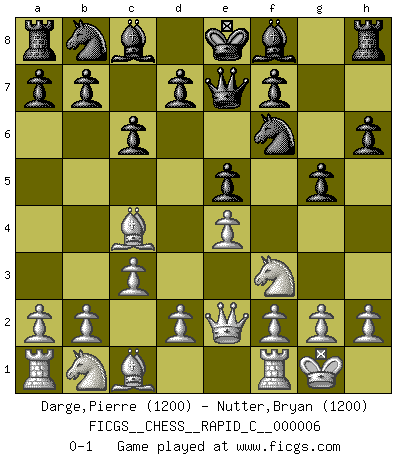 Last move : 0-1 2006 September 10 12:2:40 [Event "FICGS__CHESS__RAPID_C__000006"] [Site "FICGS"] [Date "2006.07.24"] [Round "1"] [White "Darge,Pierre"] [Black "Nutter,Bryan"] [Result "0-1"] [WhiteElo "1200"] [BlackElo "1200"] 1.e4 e5 2.Bc4 Qe7 3.c3 Nf6 4.Qe2 c6 5.Nf3 h6 6.O-O g5 0-1 This chess game has been lost on time (started : 2006.07.24 21:10:38) Bishop's Opening Kingside Castling by player White (move 6) Player Black won this chess game. Follow this game move after move (download)Chess is a sea in which a gnat may drink and an elephant may bathe. (Hindu proverb) Am wohlsten fühle ich mich, wenn ich sehe, wie sich mein Gegner im Todeskampf windet. (Robert James Fischer) Las leyes del Ajedrez no permiten una libre elección: tienes que mover quieras o no. (Emanuel Lasker) Il n'y a plus de joueurs du niveau de Jacob Murray dont la seule quête est le beau jeu, le plaisir de voir les pièces construire quelque chose. Sur 10 idées à la minute, 9 seront sans intérêt, la dernière s'avèrera géniale. (Christian Bauer) Men never do evil so completely and cheerfully as when they do it from religious conviction. (Blaise Pascal)