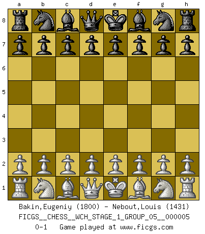 Last move : 0-1 2008 August 7 17:16:17 [Event "FICGS__CHESS__WCH_STAGE_1_GROUP_05__000005"] [Site "FICGS"] [Date "2008.07.08"] [Round "1"] [White "Bakin,Eugeniy"] [Black "Nebout,Louis"] [Result "0-1"] [WhiteElo "1800"] [BlackElo "1431"] 0-1 This chess game has been lost on time (started : 2008.07.08 16:18:31) Player Black won this chess game. Follow this game move after move (download)A thorough understanding of the typical mating continuations makes the most complicated sacrificial combinations leading up to them not only not difficult, but almost a matter of course. (Siegbert Tarrasch) Schach wird sich dank seiner hohen kulturellen Tradition immer durchsetzen. In näherer Zukunft womöglich sogar als Gegenreaktion auf die maßlose Reizüberflutung im Freizeit- und Spielbereich. (Garry Kasparov) Solo puedes ser bueno en el Ajedrez si amas al juego. (Bobby Fischer) On peut tirer plus d'utilité d'une partie perdue que de 100 parties gagnées. (Capablanca) Hardware: the parts of a computer that can be kicked. (Jeff Persis)