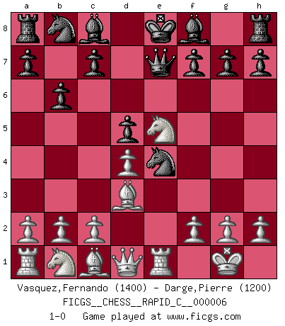 Last move : 1-0 2006 September 12 18:35:57 [Event "FICGS__CHESS__RAPID_C__000006"] [Site "FICGS"] [Date "2006.07.24"] [Round "1"] [White "Vasquez,Fernando"] [Black "Darge,Pierre"] [Result "1-0"] [WhiteElo "1400"] [BlackElo "1200"] 1.e4 e5 2.Nf3 Nf6 3.Nxe5 Qe7 4.d4 Nxe4 5.Bd3 d5 6.O-O b6 7.Re1 1-0 This chess game has been lost on time (started : 2006.07.24 21:10:38) Petrov's defense Kingside Castling by player White (move 6) Player White won this chess game. Follow this game move after move (download)When you don't know what to do, wait for your opponent to get an idea - it's sure to be wrong. (Tarrasch) Bobby Fischer ist kein Vorbild für die heutige Jugend. (Viktor Kortschnoi) La última cosa en que Fischer estaba interesado era en tonterías, siempre y cuando el Ajedrez estuviera involucrado. (Elie Agur) Un millionnaire : 'Monsieur Steinitz ! Vous ne participez aux tournois que pour l'argent, alors que moi je n'y viens que pour l'honneur.' Steinitz : 'Chacun joue pour ce qu'il n'a pas'... If you work for a living, why do you kill yourself working ? (Tuco to a chicken in The Good, The Bad and The Ugly)