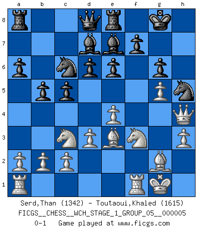 Last move : 0-1 2008 September 11 21:35:46 [Event "FICGS__CHESS__WCH_STAGE_1_GROUP_05__000005"] [Site "FICGS"] [Date "2008.07.08"] [Round "1"] [White "Serd,Than"] [Black "Toutaoui,Khaled"] [Result "0-1"] [WhiteElo "1342"] [BlackElo "1615"] 1.e4 c5 2.d3 d6 3.g3 Nf6 4.Nc3 e6 5.Bg2 Be7 6.f4 O-O 7.Nf3 Nc6 8.O-O Bd7 9.Be3 a6 10.h3 b5 11.g4 h6 12.Qe1 Re8 13.g5 hxg5 14.fxg5 Nh5 15.Qh4 g6 0-1 This chess game has been lost on time (started : 2008.07.08 16:18:31) Sicilian defense Kingside Castling by player Black (move 6) Kingside Castling by player White (move 8) Player Black won this chess game. Follow this game move after move (download)Modern Chess is too much concerned with things like Pawn structure. Forget it, Checkmate ends the game. (Nigel Short) Ein Kibitz ist einer, der deinem Gegner gute Ratschläge gibt. (Andrew Soltis) Yo nunca en mi vida he jugado la Defensa Francesa, que viene siendo la más aburrida de todas las Aperturas. (Wilhelm Steinitz) Donnez-moi un Cavalier en 6e et je gagnerais toutes mes parties. (Steinitz) Big Chess is a place for big hallucinations. (Thibault de Vassal)