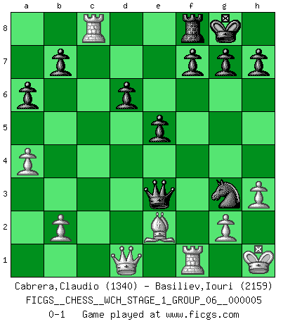 Last move : 0-1 2008 July 24 23:37:16 [Event "FICGS__CHESS__WCH_STAGE_1_GROUP_06__000005"] [Site "FICGS"] [Date "2008.07.08"] [Round "1"] [White "Cabrera,Claudio"] [Black "Basiliev,Iouri"] [Result "0-1"] [WhiteElo "1340"] [BlackElo "2159"] 1.e4 c5 2.Nf3 d6 3.d4 cxd4 4.Nxd4 Nf6 5.Nc3 a6 6.Be2 e5 7.Nb3 Be7 8.a4 O-O 9.Be3 Nc6 10.h3 Be6 11.Nd5 Nxe4 12.Bb6 Qd7 13.Nc7 Rac8 14.Nxe6 Qxe6 15.O-O Nb4 16.Rc1 Bg5 17.Be3 Bxe3 18.fxe3 Nxc2 19.Rxc2 Qxb3 20.Rxc8 Qxe3+ 21.Kh1 Ng3+ 0-1 Sicilian : Najdorf, Opovcensky variation Kingside Castling by player Black (move 8) Kingside Castling by player White (move 15) Player Black won this chess game. Follow this game move after move (download)We like to think. (Gary Kasparov) Ich tröste mich mit dem Vergnügen, daß Schachfans, Zuschauer und Leser glücklich sind, wenn ein Großmeister etwas riskiert, statt nur Klötzchen zu schieben. (Mikhail Nekhemyevich Tal) Un jugador que trata de regresar una movida en el Ajedrez es un futuro carterista. (Richard Fenton) Des combinaisons [dans le jeu d'échecs] pareilles à des mélodies. Je crois entendre pour ainsi dire la musique des coups... (Vladimir Nabokov) True nature is revealed in times of difficulty. (Chinese proverb)