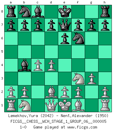 Last move : 1-0 2008 July 28 13:50:39 [Event "FICGS__CHESS__WCH_STAGE_1_GROUP_06__000005"] [Site "FICGS"] [Date "2008.07.08"] [Round "1"] [White "Lemekhov,Yura"] [Black "Nent,Alexander"] [Result "1-0"] [WhiteElo "2042"] [BlackElo "1950"] 1.d4 Nf6 2.c4 e6 3.Nf3 Bb4+ 4.Bd2 Qe7 5.g3 1-0 Bogo-Indian defense, Nimzovich variation Player White won this chess game. Follow this game move after move (download)By playing at Chess then, we may learn: First: Foresight... Second: Circumspection... Third: Caution... And lastly, we learn by Chess the habit of not being discouraged by present bad appearances in the state of our affairs, the habit of hoping for a favorable chance, and that of persevering in the secrets of resources. (Benjamin Franklin) Ich hatte Zahnschmerzen im ersten Spiel. In der zweiten Partie tat mir der Kopf weh. In der dritten war es eine Rheuma-Attacke und während der vierten fühlte ich mich nicht gut. Und in der fünften? Nun, man muss doch nicht jedes Spiel gewinnen, oder? (Savielly Grigorievitsch Tartakower) El Ajedrez es un expediente tonto que hace creer a la gente inactiva que hacen una cosa muy astuta cuando solamente estan perdiendo su tiempo. (George Bernard Shaw) Shah mat. Le roi est mort. Cri de fierté d'un joueur venant de terrasser son adversaire, courtoisement, sans effusion de sang. The Internet is the world's largest library. It's just that all the books are on the floor. (John Allen Paulos)