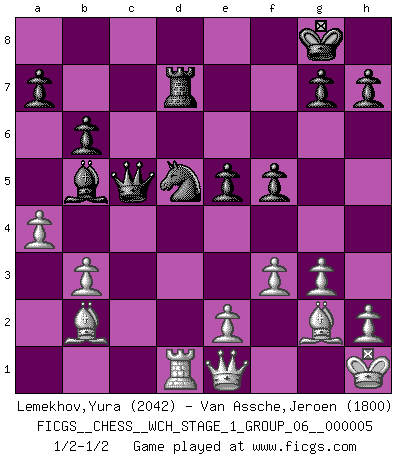 Last move : 1/2-1/2 2008 October 8 19:17:41 [Event "FICGS__CHESS__WCH_STAGE_1_GROUP_06__000005"] [Site "FICGS"] [Date "2008.07.08"] [Round "1"] [White "Lemekhov,Yura"] [Black "Van Assche,Jeroen"] [Result "1/2-1/2"] [WhiteElo "2042"] [BlackElo "1800"] 1.d4 Nf6 2.c4 e6 3.Nf3 b6 4.g3 Ba6 5.b3 Bb4+ 6.Bd2 Be7 7.Bg2 c6 8.Bc3 d5 9.Ne5 Nfd7 10.Nxd7 Nxd7 11.Nd2 O-O 12.O-O f5 13.Bb2 Bd6 14.Nf3 Rc8 15.Rc1 Qe7 16.Ne1 Nf6 17.Nd3 Ne4 18.f3 Nf6 19.Re1 c5 20.dxc5 Bxc5+ 21.Nxc5 Qxc5+ 22.Bd4 Qe7 23.cxd5 Nxd5 24.Qd2 e5 25.Rxc8 Rxc8 26.Bb2 Rd8 27.Rd1 Rd7 28.Qe1 Bb5 29.a4 Qc5+ 30.Kh1 1/2-1/2 Queen's Indian : Nimzovich variation (exaggerated Fianchetto) Kingside Castling by player Black (move 11) Kingside Castling by player White (move 12) This chess game ended in a draw. Follow this game move after move (download)Not all artists are Chess players, but all Chess players are artists. (Marcel Duchamp) Lisa Lane, amerikanische Schachmeisterin, hatte Fischer einmal als stärksten lebenden Spieler bezeichnet. Antwort: Das ist richtig, aber Lisa Lane ist eigentlich nicht in der Lage, das zu beurteilen. (Robert James Fischer) Repentinamente, me resultaba obvio en mi analisis que yo había pasado por alto lo que Fischer había visto en el tablero con la mas grande facilidad. (Mikhail Botvinnik) Une platitude souvent récitée à propos des Echecs est qu'une des choses les plus difficiles à réaliser est de gagner une position gagnante. Cela ne manque pas de sens mais, pour ma part, j'ai toujours trouvé plus difficile de gagner une position perdante. (Tim Krabbe) I've never seen so many men wasted so badly. (Blondie in The Good, The Bad and The Ugly)