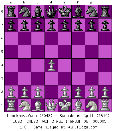Last move : 1-0 2008 August 7 17:16:17 [Event "FICGS__CHESS__WCH_STAGE_1_GROUP_06__000005"] [Site "FICGS"] [Date "2008.07.08"] [Round "1"] [White "Lemekhov,Yura"] [Black "Sadhukhan,Jyoti"] [Result "1-0"] [WhiteElo "2042"] [BlackElo "1614"] 1.d4 1-0 This chess game has been lost on time (started : 2008.07.08 16:19:59) Queen's pawn Player White won this chess game. Follow this game move after move (download)All Chess players should have a hobby. (Savielly Tartakower) Im Schach nämlich geht es darum, daß Ich des Gegners klein zu kriegen, sein Ego zu zerbrechen und zu zermahlen, seine Selbstachtung zu zertreten und zu verscharren und seine ganze mißachtenswerte sogenannte Persönlichkeit ein für alle Mal tot zu hacken und zu zerstampfen und dadurch die menschliche Gesellschaft von einer stinkenden Pestbeule zu befreien. Es ist ein königliches Spiel. (Robert James Fischer) ¿Porque tengo que perder ante este idiota?. (Aron Nimzovich) La conception d'un plan est le processus par lequel un joueur exploite les avantages de sa position tout en s'efforçant d'en réduire au minimum les inconvénients. Afin de garantir le succès, un plan doit toujours se fonder sur un diagnostic objectif des particularités d'une position. La conception d'un plan est d'autant plus difficile que la position est équilibrée, et grandement facilitée lorsqu'il n'existe qu'un seul plan susceptible de répondre aux exigences de la position. (Harry Golombek) Creativity is inventing, experimenting, growing, taking risks, breaking rules, making mistakes, and having fun. (Mary Lou Cook)