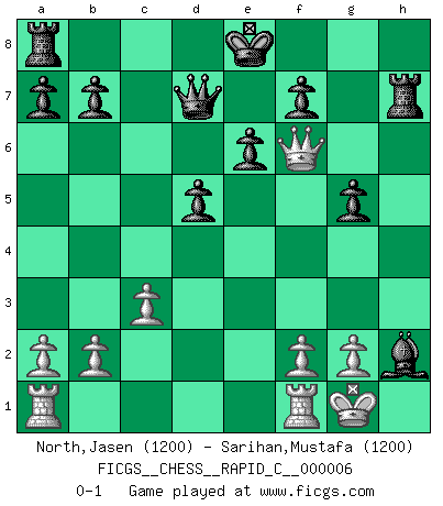 Last move : 0-1 2006 August 31 13:42:48 [Event "FICGS__CHESS__RAPID_C__000006"] [Site "FICGS"] [Date "2006.07.24"] [Round "1"] [White "North,Jasen"] [Black "Sarihan,Mustafa"] [Result "0-1"] [WhiteElo "1200"] [BlackElo "1200"] 1.e4 c5 2.Nf3 Nc6 3.d4 cxd4 4.Nxd4 e6 5.Be3 Nf6 6.Nc3 Bb4 7.Bd3 d5 8.Bg5 Nxd4 9.e5 h6 10.exf6 hxg5 11.fxg7 Rg8 12.O-O Rxg7 13.Nb5 Nxb5 14.Bxb5+ Bd7 15.Bxd7+ Qxd7 16.c3 Bd6 17.Qd4 Rh7 18.Qf6 Bxh2+ 0-1 Sicilian defense Kingside Castling by player White (move 12) Player Black won this chess game. Follow this game move after move (download)It is not a move, even the best move that you must seek, but a realizable plan. (Eugene Znosko-Borovsky) Obwohl ich vom Stil her kaum zu den Priestern der Schachkunst gezählt werde, halte ich Schach doch für eine Kunst. (Tigran Petrosjan) Nunca nadie ha ganado una partida de Ajedrez rindiendose. (Unknown) La menace est plus forte que l'exécution. (Aaron Nimzovitch) Humor is by far the most significant activity of the human brain. (Edward De Bono)