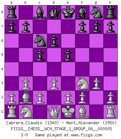 Last move : 1-0 2008 July 28 13:51:20 [Event "FICGS__CHESS__WCH_STAGE_1_GROUP_06__000005"] [Site "FICGS"] [Date "2008.07.08"] [Round "1"] [White "Cabrera,Claudio"] [Black "Nent,Alexander"] [Result "1-0"] [WhiteElo "1340"] [BlackElo "1950"] 1.Nf3 c5 2.b3 d6 3.Bb2 e5 4.d3 Nc6 5.g3 1-0 Reti Opening Player White won this chess game. Follow this game move after move (download)Only sissies Castle. (Rob Sillars) Obendrein hat der FIDE-Präsident den Revolutionsführer Gaddafi zum »Großmeister« ernannt, am Ende der WM. Das ist lächerlich! (Joel Lautier) La belleza de un movimiento no se refleja solo en su apariencia, sino en el pensamiento detrás de él. (Siegbert Tarrasch) Il (Jacob Murray) ne joue pas pour le bon coup, mais pour le meilleur. (Eloi Relange) Locking firmely the window serves nothing, only small thiefs pass through there, the big thiefs enter through the front door. (Luc-Olivier Leclerc)