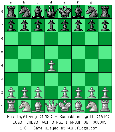 Last move : 1-0 2008 August 8 17:23:31 [Event "FICGS__CHESS__WCH_STAGE_1_GROUP_06__000005"] [Site "FICGS"] [Date "2008.07.08"] [Round "1"] [White "Ruslin,Alexey"] [Black "Sadhukhan,Jyoti"] [Result "1-0"] [WhiteElo "1700"] [BlackElo "1614"] 1.d4 1-0 This chess game has been lost on time (started : 2008.07.08 16:19:59) Queen's pawn Player White won this chess game. Follow this game move after move (download)Let the perfectionist play postal. (Yasser Seirawan) Der Freibauer hat für mich eine Seele, genau wie der Mensch, Wünsche, die unerkannt in ihm schlummern, und Befürchtungen, von deren Existenz er selbst kaum ahnt. (Aaron Nimzowitsch) El jugador táctico debe saber que hacer cuando algo se debe de hacer. El estratégico debe saber que hacer cuando nada se debe de hacer. (Savielly Tartakover) Une platitude souvent récitée à propos des Echecs est qu'une des choses les plus difficiles à réaliser est de gagner une position gagnante. Cela ne manque pas de sens mais, pour ma part, j'ai toujours trouvé plus difficile de gagner une position perdante. (Tim Krabbe) Remember : Your focus determines your reality. (Qui-Gon Jinn in Star Wars ep.1)