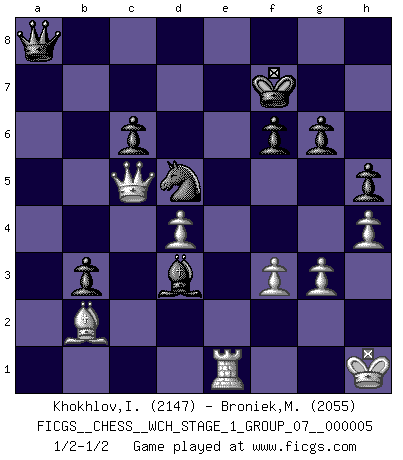 Last move : 1/2-1/2 2008 December 11 10:52:15 [Event "FICGS__CHESS__WCH_STAGE_1_GROUP_07__000005"] [Site "FICGS"] [Date "2008.07.08"] [Round "1"] [White "Khokhlov,Igor"] [Black "Broniek,Mariusz Maciej"] [Result "1/2-1/2"] [WhiteElo "2147"] [BlackElo "2055"] 1.d4 d5 2.c4 c6 3.Nf3 Nf6 4.Nc3 e6 5.e3 Nbd7 6.Bd3 dxc4 7.Bxc4 b5 8.Bd3 Bb7 9.a3 a6 10.b4 a5 11.Rb1 axb4 12.axb4 Bd6 13.O-O Qe7 14.Qb3 Nd5 15.Nxd5 exd5 16.e4 dxe4 17.Bxe4 Nf6 18.Bc2 O-O 19.Re1 Qc7 20.Bd2 Nd5 21.g3 f6 22.Bf5 g6 23.Be6+ Kg7 24.Rbc1 Qd8 25.h4 h5 26.Re2 Re8 27.Rce1 Qc7 28.Re4 Rxe6 29.Rxe6 Bc8 30.Re8 Ra7 31.Nh2 Bd7 32.R8e2 Ra4 33.Nf1 Bg4 34.f3 Bd7 35.Ne3 Nxb4 36.Nc4 Nd5 37.Nxd6 Qxd6 38.Bf4 Qf8 39.Qb2 Ra8 40.Ra1 b4 41.Rxa8 Qxa8 42.Qa2 Qb7 43.Qc4 b3 44.Bc1 Bf5 45.Bb2 Kf7 46.Qc5 Qa8 47.Qd6 Kg7 48.Re1 Kf7 49.Kh1 Qc8 50.Qa3 Qb8 51.Kg2 Bd3 52.Qc5 Qa8 53.Kh1 1/2-1/2 QGD Slav : 4.Nc3 Kingside Castling by player White (move 13) Kingside Castling by player Black (move 18) This chess game ended in a draw. Follow this game move after move (download)Chess, like any creative activity, can exist only through the combined efforts of those who have creative talent, and those who have the ability to organize their creative work. (Mikhail Botvinnik) Frage des Reporters: -Welche besonderen Umstände rechtfertigen das Anhalten der Uhren während einer Turnierpartie? Antwort: -Einen Fotographen zu strangulieren. (Siegbert Tarrasch) La esencia del Ajedrez es pensar acerca de lo que el Ajedrez es. (David Bronstein) La tactique, c'est ce que vous faites quand il y a quelque chose à faire; la stratégie, c'est ce que vous faites quand il n'y a rien à faire. (Savielli Tartacower) Thibault, I ask for draw. Game 13876. - Sorry Ilmars, you won. (FICGS chat)