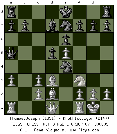 Last move : 0-1 2008 September 21 10:14:30 [Event "FICGS__CHESS__WCH_STAGE_1_GROUP_07__000005"] [Site "FICGS"] [Date "2008.07.29"] [Round "1"] [White "Thomas,Joseph"] [Black "Khokhlov,Igor"] [Result "0-1"] [WhiteElo "1851"] [BlackElo "2147"] 1.e4 e6 2.d4 d5 3.Nc3 Bb4 4.e5 Ne7 5.a3 Bxc3+ 6.bxc3 c5 7.Nf3 Bd7 8.dxc5 Qa5 9.Bd3 Na6 10.O-O Nxc5 11.Bd2 Ne4 0-1 This chess game has been lost on time (started : 2008.07.29 23:44:44) French : Winawer, Advance variation Kingside Castling by player White (move 10) Player Black won this chess game. Follow this game move after move (download)Discovered check is the dive bomber of the Chessboard. (Reuben Fine) Wenn Spassky eine Figur opfert kannst du genauso gut aufgeben. Aber wenn Tal eine Figur opfert, spiel weiter. Er könnte noch eine weitere opfern, und dann ... wer weiß? (Miguel Najdorf) Todavía soy una víctima del Ajedrez. Tiene toda la belleza del arte y mucho mas. No puede ser comercializado. El Ajedrez es mas puro que el arte en su posición social. (Marcel Duchamp) Même un GMI sait rarement calculer sur plus de cinq coups une attaque à sacrifices. (Rudolf Spielmann) There is a great deal of difference between an eager man who wants to read a book and a tired man who wants a book to read. (G.K. Chesterton)