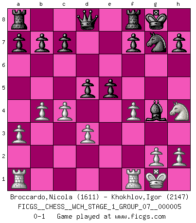 Last move : 0-1 2008 August 22 10:56:29 [Event "FICGS__CHESS__WCH_STAGE_1_GROUP_07__000005"] [Site "FICGS"] [Date "2008.07.08"] [Round "1"] [White "Broccardo,Nicola"] [Black "Khokhlov,Igor"] [Result "0-1"] [WhiteElo "1611"] [BlackElo "2147"] 1.c4 e5 2.Nc3 Nf6 3.e4 Nc6 4.Nf3 Bb4 5.Be2 d6 6.O-O O-O 7.Nd5 Nxe4 8.d3 Nf6 9.Bg5 Be6 10.Bxf6 gxf6 11.Nxb4 Nxb4 12.a3 Nc6 13.b4 Ne7 14.Nh4 d5 15.Bg4 f5 16.Bxf5 Nxf5 17.Qg4+ Ng7 18.f4 Bxg4 0-1 English Opening Kingside Castling by player White (move 6) Kingside Castling by player Black (move 6) Player Black won this chess game. Follow this game move after move (download)When you don't know what to do, wait for your opponent to get an idea - it's sure to be wrong. (Tarrasch) Die starken Figuren des Gegners muss man abtauschen. (José Raúl Capablanca) El Ajedrez, como la música, como el amor, tiene el poder de hacer feliz a la gente. (Siegbert Tarrasch) Un millionnaire : 'Monsieur Steinitz ! Vous ne participez aux tournois que pour l'argent, alors que moi je n'y viens que pour l'honneur.' Steinitz : 'Chacun joue pour ce qu'il n'a pas'... You must have a dream in order to have it come true. (A.P.J. Kalam)