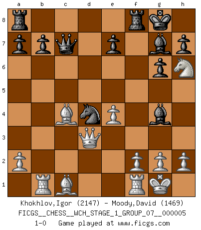 Last move : 1-0 2008 August 1 18:9:50 [Event "FICGS__CHESS__WCH_STAGE_1_GROUP_07__000005"] [Site "FICGS"] [Date "2008.07.08"] [Round "1"] [White "Khokhlov,Igor"] [Black "Moody,David"] [Result "1-0"] [WhiteElo "2147"] [BlackElo "1469"] 1.d4 Nf6 2.c4 g6 3.Nc3 d5 4.cxd5 Nxd5 5.e4 Nxc3 6.bxc3 c5 7.Bc4 cxd4 8.cxd4 Qb6 9.Qd3 Bg7 10.Nf3 O-O 11.O-O Bg4 12.Rb1 Qc7 13.Ng5 Nc6 14.Nxf7 Nxd4 15.Nh6+ 1-0 King's Indian defense, 3.Nc3 Kingside Castling by player Black (move 10) Kingside Castling by player White (move 11) Player White won this chess game. Follow this game move after move (download)Morphy was probably the greatest genius of them all. (Bobby Fischer) Wenn ich gewinne bin ich ein Genie. Wenn nicht, dann bin ich keines. (Robert James Fischer) Siempre es mejor sacrificar los hombres de tu oponente. (Savielly Tartakower) La vérité est comme le meilleur coup aux échecs : elle existe, mais il faut la chercher. (Arturo Perez-Reverte) Philosophers use a language that is already deformed as though by shoes that are too tight. (Ludwig Wittgenstein)