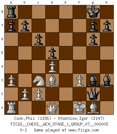Last move : 0-1 2008 August 30 21:43:43 [Event "FICGS__CHESS__WCH_STAGE_1_GROUP_07__000005"] [Site "FICGS"] [Date "2008.07.08"] [Round "1"] [White "Cook,Phil"] [Black "Khokhlov,Igor"] [Result "0-1"] [WhiteElo "1336"] [BlackElo "2147"] 1.e4 e6 2.d4 d5 3.exd5 exd5 4.Nf3 Bd6 5.a3 Ne7 6.Nc3 c6 7.Bd3 Nd7 8.O-O Nf6 9.Re1 O-O 10.Ne5 Ng6 11.Nxg6 fxg6 12.Be3 Bxh2+ 13.Kf1 Ng4 14.Re2 Qh4 15.f3 Bg3 16.Bg1 Rxf3+ 17.gxf3 Ne3+ 18.Bxe3 Qh1+ 19.Bg1 Bh3+ 20.Rg2 Qxg2+ 0-1 French : Exchange variation Kingside Castling by player White (move 8) Kingside Castling by player Black (move 9) Player Black won this chess game. Follow this game move after move (download)After black's reply to 1.e4 with 1..e5, leaves him always trying to get into the game. (Howard Staunton) Kann Schach nicht schließlich das Nationalspiel der Deutschen werden? Und welche weiteren Ausblicke bieten sich dann dar! Welche Hebung des allgemeinen Kultur-Niveaus, ja der Moral, wenn das Schachbrett den Kartentisch verdrängen würde! Wahrlich, ein Ziel, des Schweißes der Edlen wert! (Siegbert Tarrasch) No es una movida, aún la mejor movida que tu debas buscar, sino un plan comprensible. (Eugene Znosko-Borovsky) A chaque perte on perd un peu de soi. (Joël Lautier) Without deviation from the norm, progress is not possible. (Frank Zappa)