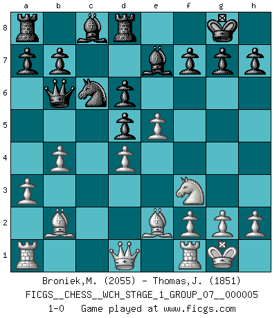 Last move : 1-0 2008 September 18 10:2:6 [Event "FICGS__CHESS__WCH_STAGE_1_GROUP_07__000005"] [Site "FICGS"] [Date "2008.07.29"] [Round "1"] [White "Broniek,Mariusz Maciej"] [Black "Thomas,Joseph"] [Result "1-0"] [WhiteElo "2055"] [BlackElo "1851"] 1.e4 c5 2.Nf3 Nf6 3.e5 Nd5 4.Nc3 e6 5.Nxd5 exd5 6.d4 Qb6 7.Be2 cxd4 8.O-O Nc6 9.c3 d6 10.cxd4 Be7 11.a3 O-O 12.b4 Rd8 13.Bb2 1-0 This chess game has been lost on time (started : 2008.07.29 23:44:44) Sicilian : Nimzovich-Rubinstein variation Kingside Castling by player White (move 8) Kingside Castling by player Black (move 11) Player White won this chess game. Follow this game move after move (download)I won't play with you anymore. You have insulted my friend. - When an opponent cursed himself for a blunder. (Miguel Najdorf) Karpov ist ein Museumsstück. (Garry Kasparov) Una victoria por una combinación errónea, aunque sea espectacular, me llena de horror artístico. (Wilhelm Steinitz) Les échecs sont un jeu terrible. Si vous n'avez pas le centre, votre adversaire a une position plus libre. Par contre, si vous avez le centre, alors vous avez vraiment quelque chose pour laquelle vous inquiéter ! (Siegbert Tarrasch) Yoga is 99% practice and 1% knowledge. (Sri Krishna Pattabhi Jois)