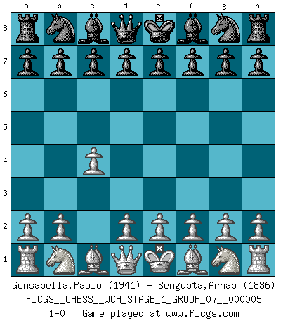 Last move : 1-0 2008 August 9 5:24:21 [Event "FICGS__CHESS__WCH_STAGE_1_GROUP_07__000005"] [Site "FICGS"] [Date "2008.07.08"] [Round "1"] [White "Gensabella,Paolo"] [Black "Sengupta,Arnab"] [Result "1-0"] [WhiteElo "1941"] [BlackElo "1836"] 1.c4 1-0 This chess game has been lost on time (started : 2008.07.08 16:21:14) English Opening Player White won this chess game. Follow this game move after move (download)What is the object of playing a gambit opening?... To acquire a reputation of being a dashing player at the cost of losing a game. (Siegbert Tarrasch) Die Arbeit ist etwas Unnatürliches. Die Faulheit allein ist göttlich. (Anatole France) No hay precio que no valga la pena por la cabellera del Rey enemigo. (Koblentz) Dieu déplace le joueur, et celui-ci la pièce. Quel Dieu derrière Dieu commence donc la trame ? Arturo Perez-Reverte (prix de littérature policière 1993). Only sick music makes money today. (Friedrich Nietzsche)