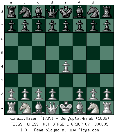 Last move : 1-0 2008 August 8 5:18:8 [Event "FICGS__CHESS__WCH_STAGE_1_GROUP_07__000005"] [Site "FICGS"] [Date "2008.07.08"] [Round "1"] [White "Kirali,Hasan"] [Black "Sengupta,Arnab"] [Result "1-0"] [WhiteElo "1739"] [BlackElo "1836"] 1.e4 1-0 This chess game has been lost on time (started : 2008.07.08 16:21:14) King's pawn Opening Player White won this chess game. Follow this game move after move (download)Life is a kind of Chess, with struggle, competition, good and ill events. (Benjamin Franklin) Man gibt nur Pakete auf. (Paul Keres) Durante una competencia de Ajedrez, un Maestro de Ajedrez deberá ser una combinación de presa de caza y un Monge. (Alexander Alekhine) Le génie consiste à savoir transgresser les règles au moment opportun. (Teichmann) When a man with money meets a man with experience, the man with experience leaves with money and the man with money leaves with experience. (Anonymous)