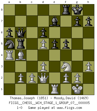 Last move : 1-0 2008 August 4 4:33:7 [Event "FICGS__CHESS__WCH_STAGE_1_GROUP_07__000005"] [Site "FICGS"] [Date "2008.07.29"] [Round "1"] [White "Thomas,Joseph"] [Black "Moody,David"] [Result "1-0"] [WhiteElo "1851"] [BlackElo "1469"] 1.e4 e5 2.Nf3 Nc6 3.Bb5 a6 4.Ba4 Nf6 5.O-O Be7 6.Re1 b5 7.Bb3 O-O 8.h3 Bb7 9.d3 d6 10.a3 Na5 11.Ba2 c5 12.Nc3 b4 13.axb4 cxb4 14.Nd5 Nxd5 15.Bxd5 Bxd5 16.exd5 f5 17.Bd2 Rb8 18.Ra4 Rb5 19.Bxb4 Qb6 20.Qd2 1-0 Ruy Lopez : Closed, 7...O-O Kingside Castling by player White (move 5) Kingside Castling by player Black (move 7) Player White won this chess game. Follow this game move after move (download)Everything is in a state of flux, and this includes the world of Chess. (Mikhail Botvinnik) Es hat in meinem Leben Zeiten gegeben, da ich sehr nahe daran war zu glauben, daß ich auch nicht eine einzige Schachpartie verlieren könnte. (José Raúl Capablanca) Nos gusta pensar. (Gary Kasparov) Il vaut mieux sacrifier les pièces de l'adversaire. (Xavier Tartacover) I fear not the man who has practiced 10,000 kicks once, but I fear the man who has practiced one kick 10,000 times. (Bruce Lee)