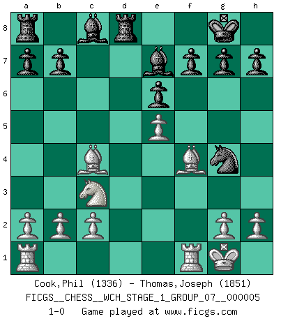Last move : 1-0 2008 September 26 22:26:16 [Event "FICGS__CHESS__WCH_STAGE_1_GROUP_07__000005"] [Site "FICGS"] [Date "2008.07.29"] [Round "1"] [White "Cook,Phil"] [Black "Thomas,Joseph"] [Result "1-0"] [WhiteElo "1336"] [BlackElo "1851"] 1.e4 c5 2.Nf3 Nf6 3.Nc3 d6 4.Bc4 Nc6 5.d4 cxd4 6.Nxd4 e6 7.O-O Be7 8.f4 O-O 9.e5 Nxd4 10.Qxd4 dxe5 11.Qxd8 Rxd8 12.fxe5 Ng4 13.Bf4 1-0 This chess game has been lost on time (started : 2008.07.29 23:44:44) Sicilian : Nimzovich-Rubinstein variation Kingside Castling by player White (move 7) Kingside Castling by player Black (move 8) Player White won this chess game. Follow this game move after move (download)The tactician must know what to do whenever something needs doing; the strategist must know what to do when nothing needs doing. (Savielly Tartakover) Dein Körper muss in Topform sein. Dein Schach verfällt, wenn dein Körper verfällt. Der Körper kann nicht vom Geist getrennt werden. (Robert James Fischer) Es muy difícil jugar en contra de la teoría de Einstein. - en su primera derrota en contra de Fischer (Mikhail Tal) Soyez une menace à chaque fois que vous vous asseyez pour jouer. (Ken Smith) The existence of forgetting has never been proved: We only know that some things don't come to mind when we want them. (Friedrich Nietzsche)