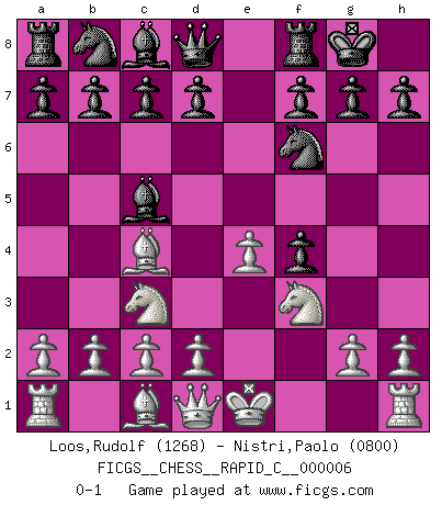 Last move : 0-1 2006 August 31 6:58:36 [Event "FICGS__CHESS__RAPID_C__000006"] [Site "FICGS"] [Date "2006.07.24"] [Round "1"] [White "Loos,Rudolf"] [Black "Nistri,Paolo"] [Result "0-1"] [WhiteElo "1268"] [BlackElo "0800"] 1.e4 e5 2.Bc4 Nf6 3.Nc3 Bc5 4.f4 O-O 5.Nf3 exf4 0-1 This chess game has been lost on time (started : 2006.07.24 21:10:38) Bishop's Opening : Berlin defense Kingside Castling by player Black (move 4) Player Black won this chess game. Follow this game move after move (download)In the perfect Chess combination as in a first-rate short story, the whole plot and counter-plot should lead up to a striking finale, the interest not being allayed until the very last moment. (Yates and Winter) Die FIDE ist dabei in die Hände der russischen Mafia zu fallen. (Larry Evans) Los tropiezos estan todos ahí en el tablero, esperando que se cometan. (Savielly Tartakover) Nous vivons dans un monde échiquéen : chaque jour qui passe est un défi à relever. (Philosophe Sasha) Art is the triumph over chaos. (John Cheever)