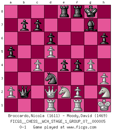 Last move : 0-1 2008 August 12 16:18:43 [Event "FICGS__CHESS__WCH_STAGE_1_GROUP_07__000005"] [Site "FICGS"] [Date "2008.07.08"] [Round "1"] [White "Broccardo,Nicola"] [Black "Moody,David"] [Result "0-1"] [WhiteElo "1611"] [BlackElo "1469"] 1.c4 Nf6 2.Nc3 g6 3.e4 d6 4.Nf3 Bg7 5.d4 O-O 6.Be2 e5 7.d5 a5 8.O-O Na6 9.Bg5 h6 10.Bh4 Bd7 11.Bxf6 Bxf6 12.h3 Nc5 13.Qd2 Bg7 14.Nh2 f5 15.exf5 gxf5 16.Rae1 Qf6 17.Bh5 Be8 18.Bxe8 Raxe8 19.g4 e4 20.Kh1 f4 21.Ne2 Nd3 22.Rd1 Qxb2 0-1 English Opening Kingside Castling by player Black (move 5) Kingside Castling by player White (move 8) Player Black won this chess game. Follow this game move after move (download)War is the child of passion, passion is the child of narcissism and narcissism is the child. (...) Another game ? (Thibault de Vassal) Meine Liebe ist Schach, Schach, Schach. Ich muss jeden Tag Schach spielen, deshalb fühle ich mich so stark. (Miguel Najdorf) En la perfecta combinación de Ajedrez como en una historia corta de primera clase, toda la trama y contra trama deberá conducir hacia un final sorprendente, el interes no es mitigado hasta el último momento. (Yates and Winter) L'attaque fait le spectacle, la défense gagne les matchs. (Dicton footballistique) Big Chess is a place for big hallucinations. (Thibault de Vassal)