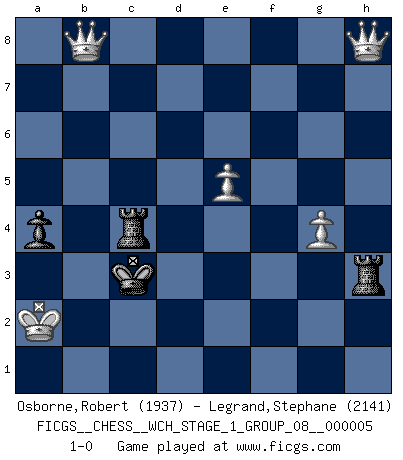 Last move : 1-0 2008 November 16 0:10:48 [Event "FICGS__CHESS__WCH_STAGE_1_GROUP_08__000005"] [Site "FICGS"] [Date "2008.07.08"] [Round "1"] [White "Osborne,Robert"] [Black "Legrand,Stephane"] [Result "1-0"] [WhiteElo "1937"] [BlackElo "2141"] 1.e4 c5 2.Nf3 d6 3.d4 cxd4 4.Nxd4 Nf6 5.Nc3 Nc6 6.Bg5 e6 7.Qd2 Be7 8.O-O-O O-O 9.f4 d5 10.e5 Nd7 11.Bxe7 Qxe7 12.Nf3 Rd8 13.h4 Nc5 14.h5 b6 15.Bb5 Bb7 16.Bxc6 Bxc6 17.Nd4 Bb7 18.Qe3 Ne4 19.Kb1 Qc5 20.Nce2 Rac8 21.g4 Ba6 22.Ng3 Bc4 23.h6 g6 24.b3 Ba6 25.Nxe4 dxe4 26.Qxe4 Rd7 27.Rh2 Bb7 28.Qe3 b5 29.Rhd2 Bd5 30.f5 a6 31.Rf2 Qe7 32.Rdf1 b4 33.fxg6 fxg6 34.a3 Rb8 35.Rf7 Qxf7 36.Rxf7 Rxf7 37.axb4 Rxb4 38.Ka2 Rc7 39.c4 Bxc4 40.Ka3 a5 41.bxc4 R7xc4 42.Nb3 Ra4+ 43.Kb2 Rab4 44.Qa7 Kf8 45.Qg7+ Ke8 46.Qh8+ Kd7 47.Qxh7+ Kc6 48.Qxg6 a4 49.h7 Rxb3+ 50.Ka2 Rh3 51.Qxe6+ Kb5 52.Qe8+ Kb4 53.Qb8+ Kc3 54.h8Q 1-0 Sicilian : Richter-Rauzer, Rauzer attack, 7...Be7 Queenside Castling by player White (move 8) Kingside Castling by player Black (move 8) 10 pieces endgame at move 49 : White KQPPP , Black KRRPP WHITE : King + 1 Queen 3 Pawns BLACK : King + 2 Rooks 2 Pawns 9 pieces endgame at move 51 : White KQPPP , Black KRRP WHITE : King + 1 Queen 3 Pawns BLACK : King + 2 Rooks 1 Pawn Promotion Queen by player White (move 54) Player White won this chess game. Follow this game move after move (download)At this time Fischer is simply a level above all the best Chessplayers in the world. (John Jacobs) Jeder Schachmeister war einmal ein Anfänger. (Irving Chernev) Nunca nadie ha ganado una partida de Ajedrez rindiendose. (Unknown) Des idées, des idées, j'en ai cent, j'en ai mille. Des bonnes, des mauvaises, applicables, irréalisables... Il suffit de faire le tri ! (Roos) All men can see these tactics whereby I conquer, but what none can see is the strategy out of which victory is evolved. (Sun Tzu)