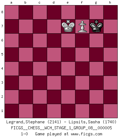 Last move : 1-0 2008 September 18 3:16:18 [Event "FICGS__CHESS__WCH_STAGE_1_GROUP_08__000005"] [Site "FICGS"] [Date "2008.07.08"] [Round "1"] [White "Legrand,Stephane"] [Black "Lipsits,Sasha"] [Result "1-0"] [WhiteElo "2141"] [BlackElo "1740"] 1.e4 c6 2.Nc3 d5 3.Nf3 Bg4 4.h3 Bxf3 5.Qxf3 e6 6.d3 Nf6 7.a3 Nbd7 8.Qg3 dxe4 9.dxe4 Nh5 10.Qf3 g6 11.g4 Qf6 12.Qxf6 Nhxf6 13.Bd2 O-O-O 14.O-O-O Bc5 15.f4 Bd4 16.Bg2 e5 17.Ne2 Nc5 18.Nxd4 exd4 19.Ba5 b6 20.Be1 h6 21.Bh4 Ncxe4 22.Bxe4 Nxe4 23.Bxd8 Rxd8 24.Rde1 f5 25.gxf5 gxf5 26.Rhg1 d3 27.cxd3 Rxd3 28.Rg7 a5 29.Reg1 Rxh3 30.R1g6 Rh1+ 31.Kc2 Rh2+ 32.Kb1 Rd2 33.Rxc6+ Kd8 34.Rxh6 Rd7 35.Rxd7+ Kxd7 36.Rxb6 Nd6 37.Rxd6+ Kxd6 38.Kc2 Kd5 39.Kd3 a4 40.b3 axb3 41.Kc3 b2 42.Kxb2 Kc4 43.a4 Kb4 44.a5 Kxa5 45.Kc3 Kb5 46.Kd4 Kc6 47.Ke5 Kd7 48.Kxf5 Ke7 49.Kg6 Kf8 50.f5 Kg8 51.Kf6 Kf8 52.Ke6 Ke8 53.f6 Kf8 54.f7 Kg7 55.Ke7 1-0 Caro-Kann : Two knights, 3...Bg4 Queenside Castling by player Black (move 13) Queenside Castling by player White (move 14) 10 pieces endgame at move 35 : White KRPPP , Black KNPPP WHITE : King + 1 Rook 3 Pawns BLACK : King + 1 Knight 3 Pawns 9 pieces endgame at move 36 : White KRPPP , Black KNPP WHITE : King + 1 Rook 3 Pawns BLACK : King + 1 Knight 2 Pawns 8 pieces endgame at move 37 : White KRPPP , Black KPP WHITE : King + 1 Rook 3 Pawns BLACK : King + 2 Pawns 7 pieces endgame at move 37 : White KPPP , Black KPP WHITE : King + 3 Pawns BLACK : King + 2 Pawns 6 pieces endgame at move 40 : White KPP , Black KPP WHITE : King + 2 Pawns BLACK : King + 2 Pawns 5 pieces endgame at move 42 : White KPP , Black KP WHITE : King + 2 Pawns BLACK : King + 1 Pawn 4 pieces endgame at move 44 : White KP , Black KP WHITE : King + 1 Pawn BLACK : King + 1 Pawn 3 pieces endgame at move 48 : White KP , Black K WHITE : King + 1 Pawn BLACK : King + Player White won this chess game. Follow this game move after move (download)A big shock; the best chess player in history has passed away. (Lajos Portisch, about Bobby Fischer's death) Ich bin es gewohnt, das die Jugend mir überhaupt keinen Respekt entgegenbringt. (Alexander Morozewich) ¡Examina movidas que hagan daño! Un buen ojo for movidas desvastantes es mucho mas importante que el conocimiento de principios estratégicos. (Purdy) La tactique, c'est ce que vous faites quand il y a quelque chose à faire; la stratégie, c'est ce que vous faites quand il n'y a rien à faire. (Savielli Tartacower) Chess is everything: art, science and sport. (Anatoly Karpov)