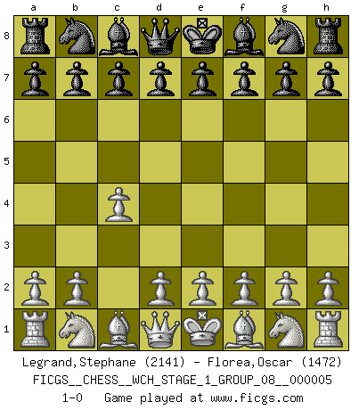 Last move : 1-0 2008 August 7 17:16:17 [Event "FICGS__CHESS__WCH_STAGE_1_GROUP_08__000005"] [Site "FICGS"] [Date "2008.07.08"] [Round "1"] [White "Legrand,Stephane"] [Black "Florea,Oscar"] [Result "1-0"] [WhiteElo "2141"] [BlackElo "1472"] 1.c4 1-0 This chess game has been lost on time (started : 2008.07.08 16:22:44) English Opening Player White won this chess game. Follow this game move after move (download)No one ever won a game by resigning. (Unknown) Die FIDE ist dabei in die Hände der russischen Mafia zu fallen. (Larry Evans) Los asuntos humanos son como una partida de Ajedrez: solo aquellos que no lo toman seriamente, pueden ser llamados buenos jugadores. (Hung Tzu Ch'eng) Les Echecs, c'est l'art de la guerre sans les charniers, c'est la résurrection des morts tombés au champ d'honneur, l'espoir perpétuel, la suprématie de l'intelligence sur la force, la culture de l'esprit. (F. Szpiner) Lamb in skin of tiger, still fears the wolf. (Chinese proverb)