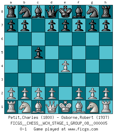 Last move : 0-1 2008 August 20 6:39:56 [Event "FICGS__CHESS__WCH_STAGE_1_GROUP_08__000005"] [Site "FICGS"] [Date "2008.07.08"] [Round "1"] [White "Petit,Charles"] [Black "Osborne,Robert"] [Result "0-1"] [WhiteElo "1800"] [BlackElo "1937"] 1.e4 c5 0-1 This chess game has been lost on time (started : 2008.07.08 16:22:44) Sicilian defense Player Black won this chess game. Follow this game move after move (download)Chess is a beautiful mistress. (Bent Larsen) Man gibt nur Pakete auf. (Paul Keres) El poder defensivo de una pieza clavada, solamente es imaginario. (Aaron Nimzovich) Les ravages du H expliquent la différence de niveau entre Tal et Thal [Abergel]. All art requires courage. (Anne Tucker)