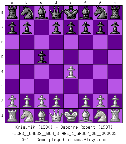 Last move : 0-1 2008 August 17 6:13:37 [Event "FICGS__CHESS__WCH_STAGE_1_GROUP_08__000005"] [Site "FICGS"] [Date "2008.07.08"] [Round "1"] [White "Kris,Mik"] [Black "Osborne,Robert"] [Result "0-1"] [WhiteElo "1300"] [BlackElo "1937"] 1.e4 c5 0-1 This chess game has been lost on time (started : 2008.07.08 16:22:44) Sicilian defense Player Black won this chess game. Follow this game move after move (download)The enormous mental resilience, without which no Chess player can exist, was so much taken up by Chess that he could never free his mind of this game. (Albert Einstein) Nie in meinem Leben habe ich die französische Verteidigung gespielt, welche die Stumpfsinnigste von allen ist. (Wilhelm Steinitz) Observen a Garry Kasparov. Después de una derrota, invariablemente el gana la próxima partida. Prácticamente hace pedazos a su siguiente oponente. Eso es algo que tenemos que aprender a lograr. (Maurice Ashley) Ne tendez aucun piège pour le plaisir ! Ne jouez rien dans l'espoir que l'adversaire réagisse de façon stupide ! Prenez toujours pour acquis que l'adversaire va trouver le meilleur coup ! Ne jouez jamais de coup dans l'espoir que l'adversaire ne voie pas la menace ! Chacun de vos coups doit améliorer la position d'une façon ou d'une autre. Sometimes it pays to stay in bed in Monday, rather than spending the rest of the week debugging Monday's code. (Dan Salomon)