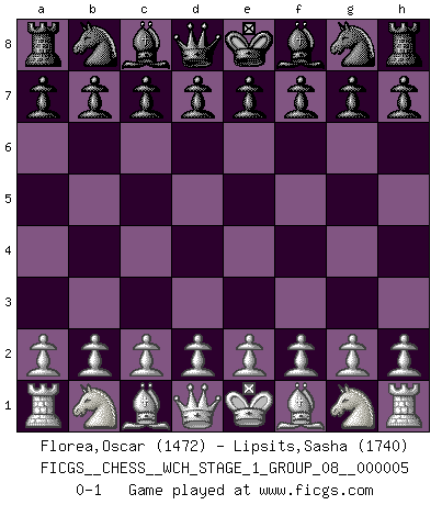 Last move : 0-1 2008 August 7 17:16:17 [Event "FICGS__CHESS__WCH_STAGE_1_GROUP_08__000005"] [Site "FICGS"] [Date "2008.07.08"] [Round "1"] [White "Florea,Oscar"] [Black "Lipsits,Sasha"] [Result "0-1"] [WhiteElo "1472"] [BlackElo "1740"] 0-1 This chess game has been lost on time (started : 2008.07.08 16:22:44) Player Black won this chess game. Follow this game move after move (download)A player surprised is half beaten. (Proverb) Jeder Schachmeister war einmal ein Anfänger. (Irving Chernev) El poder defensivo de una pieza clavada, solamente es imaginario. (Aaron Nimzovich) La menace est plus forte que l'exécution. (Aaron Nimzovitch) Macintosh - we might not get everything right, but at least we knew the century was going to end. (Douglas Adams)