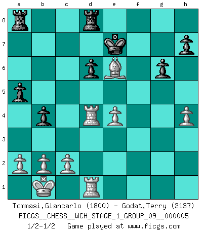 Last move : 1/2-1/2 2008 September 6 22:39:59 [Event "FICGS__CHESS__WCH_STAGE_1_GROUP_09__000005"] [Site "FICGS"] [Date "2008.07.08"] [Round "1"] [White "Tommasi,Giancarlo"] [Black "Godat,Terry"] [Result "1/2-1/2"] [WhiteElo "1800"] [BlackElo "2137"] 1.e4 c5 2.Nf3 d6 3.d4 cxd4 4.Nxd4 Nf6 5.Nc3 a6 6.Be3 e5 7.Nb3 Be6 8.f3 Nbd7 9.g4 b5 10.g5 b4 11.Ne2 Nh5 12.Ng3 Nf4 13.Qd2 Qxg5 14.O-O-O Be7 15.Kb1 Qf6 16.Rg1 O-O 17.Bxf4 Qxf4 18.Qxf4 exf4 19.Nh5 g6 20.Nd4 Rfc8 21.Nxf4 Nc5 22.Nfxe6 fxe6 23.Bc4 Kf7 24.f4 Bf6 25.f5 Bxd4 26.Rxd4 Ke7 27.fxe6 a5 28.Rgd1 Rd8 29.h4 Nxe6 30.Bxe6 1/2-1/2 Sicilian : Najdorf, Byrne (English) attack Queenside Castling by player White (move 14) Kingside Castling by player Black (move 16) This chess game ended in a draw. Follow this game move after move (download)Chess is above all, a fight ! (Emanuel Lasker) Wenn Schach ein enormer Dschungel ist, der seine Myriaden von Geheimnissen nicht preisgeben will, dann sind Computer die Kettensägen einer gewaltigen ökologisch unsensiblen Nutzholzfirma. (Nigel Short) El Ajedrez, como cualquier actividad creativa, solo puede existir a través del esfuerzo combinado de aquellos que tienen talento creativo y de aquellos que poseen la habilidad de organizar su trabajo creativo. (Mikhail Botvinnik) Seul un grand joueur sait à quel point il joue faiblement. (Xavier Tartacover) Being number two sucks. (Andre Agassi)