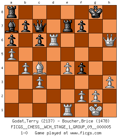 Last move : 1-0 2008 August 19 13:23:7 [Event "FICGS__CHESS__WCH_STAGE_1_GROUP_09__000005"] [Site "FICGS"] [Date "2008.07.08"] [Round "1"] [White "Godat,Terry"] [Black "Boucher,Brice"] [Result "1-0"] [WhiteElo "2137"] [BlackElo "1478"] 1.e4 e5 2.Bc4 Nf6 3.d3 Bc5 4.Nf3 Nc6 5.c3 h6 6.b4 Bb6 7.a4 a6 8.O-O d6 9.Nbd2 Bg4 10.h3 Bh5 11.Re1 O-O 12.Nf1 Re8 13.Ng3 Bg6 14.Nh4 Bh7 15.a5 Ba7 16.Qf3 Ne7 17.Bxh6 d5 18.exd5 Nexd5 19.Ngf5 g6 20.Ng3 c6 21.Bg5 Qd6 22.Ne4 Nxe4 23.dxe4 Nf4 24.Rad1 Qc7 25.Bxf4 exf4 26.Qg4 Re7 27.Nxg6 Bxg6 28.Qxg6+ Kf8 29.Qh6+ Kg8 30.Rd6 1-0 Bishop's Opening : Berlin defense Kingside Castling by player White (move 8) Kingside Castling by player Black (move 11) Player White won this chess game. Follow this game move after move (download)Chess is so inspiring that I do not believe a good player is capable of having an evil thought during the game. (Wilhelm Steinitz) Rubinstein ist ein Turmendspiel, welches die Götter vor tausenden von Jahren begannen. (Savielly Grigorievitsch Tartakower) El Ajedrez es el juego mas altamente simbólico, pero las agresiones estan por lo tanto aún mas francamente representadas en la partida. Tal vez comenzo como un juego de guerra; Algo como la representación de una batalla en miniatura entre las fuerzas de dos reinos. (Karl Meninger) Dans le domaine de la peinture, de la gravure et de la sculpture, dès la première décennie de notre siècle, les artistes abandonnent la représentation de la partie d'échecs pour se concentrer sur les pièces, sur les échiquiers et sur toutes les variations auxquelles les unes et les autres peuvent donner lieu. On passe en quelque sorte d'un thème social à un thème musical (au sens de la musica médiévale, c'est-à-dire d'une notion qui inclue le rythme, l'harmonie, la construction et la déconstruction, etc.). Graphiquement et picturalement, l'échiquier apparaît comme une structure ouverte, dynamique, d'une richesse infinie, autorisant toutes les combinatoires et débouchant sur des mouvements et des rythmes de nature exponentielle. (Michel Pastoureau) In God we trust, all others we virus scan. (Anonymous)