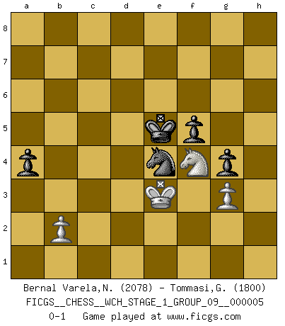 Last move : 0-1 2009 March 8 22:24:29 [Event "FICGS__CHESS__WCH_STAGE_1_GROUP_09__000005"] [Site "FICGS"] [Date "2008.07.08"] [Round "1"] [White "Bernal Varela,Nelson"] [Black "Tommasi,Giancarlo"] [Result "0-1"] [WhiteElo "2078"] [BlackElo "1800"] 1.e4 e6 2.d4 d5 3.Nd2 c5 4.exd5 Qxd5 5.Ngf3 cxd4 6.Bc4 Qd6 7.O-O Nf6 8.Nb3 Nc6 9.Nbxd4 Nxd4 10.Nxd4 a6 11.c3 Qc7 12.Bd3 Bd7 13.Qf3 Bd6 14.h3 O-O 15.Re1 Bh2+ 16.Kh1 Be5 17.Bg5 h6 18.Bh4 Rac8 19.Nb3 Bc6 20.Qe2 Nd7 21.Rad1 Rfe8 22.Be4 Bxe4 23.Qxe4 g5 24.Bg3 Bxg3 25.fxg3 Rcd8 26.Kh2 Nf6 27.Qf3 Rxd1 28.Rxd1 Kg7 29.Rf1 Qe7 30.Nd4 Rd8 31.g4 Rd7 32.g3 Nd5 33.Qe2 Qd6 34.Rd1 Qc5 35.Qe5+ Kg8 36.Rd2 Qc7 37.Qxc7 Rxc7 38.Kg2 b5 39.Nc2 Kf8 40.Kf3 Nb6 41.Ne3 Ke7 42.Rc2 a5 43.Ke4 Na4 44.Kf3 f6 45.h4 Rc6 46.c4 b4 47.Re2 Kd7 48.Nd1 Nc5 49.Ke3 b3 50.axb3 Rb6 51.Rc2 Rxb3+ 52.Rc3 Rb4 53.Ra3 a4 54.Kd4 Kd6 55.hxg5 hxg5 56.Kc3 Rb7 57.Kd4 Rb8 58.Re3 Kc6 59.Kc3 Rb7 60.Kc2 Kd6 61.Kd2 f5 62.gxf5 exf5 63.Ra3 Ke5 64.Kc2 Rb4 65.Kc3 Rb6 66.Kc2 g4 67.Nc3 Rb4 68.Ne2 Rxc4+ 69.Kd2 Rb4 70.Re3+ Kd6 71.Kc1 Re4 72.Kd2 Rxe3 73.Kxe3 Ke5 74.Nf4 Ne4 0-1 French : Tarrasch, Open variation Kingside Castling by player White (move 7) Kingside Castling by player Black (move 14) 10 pieces endgame at move 72 : White KNPP , Black KRNPPP WHITE : King + 1 Knight 2 Pawns BLACK : King + 1 Rook 1 Knight 3 Pawns 9 pieces endgame at move 73 : White KNPP , Black KNPPP WHITE : King + 1 Knight 2 Pawns BLACK : King + 1 Knight 3 Pawns Player Black won this chess game. Follow this game move after move (download)In Chess, at least, the brave inherit the earth. (Edmar Mednis) Ein unbeabsichtigtes Patt ist der Gipfel der Dummheit. (Anonymous) Un buen jugador siempre tiene buena suerte. (José Raúl Capablanca) Les sacrifices démontrent seulement que quelqu'un a gaffé. (Savielly Tartacover) You can only get smarter by playing a smarter opponent. (Revolver, movie)