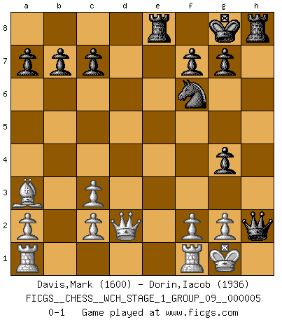 Last move : 0-1 2008 July 21 15:51:10 [Event "FICGS__CHESS__WCH_STAGE_1_GROUP_09__000005"] [Site "FICGS"] [Date "2008.07.08"] [Round "1"] [White "Davis,Mark"] [Black "Dorin,Iacob"] [Result "0-1"] [WhiteElo "1600"] [BlackElo "1936"] 1.e4 e5 2.d4 exd4 3.Qxd4 Nc6 4.Qd1 Nf6 5.Nc3 Bb4 6.Bd3 d5 7.exd5 Qxd5 8.Nf3 Bg4 9.Qe2+ Kf8 10.O-O Bxc3 11.bxc3 Re8 12.Qd1 Ne5 13.Be2 h5 14.Nxe5 Qxe5 15.Bxg4 hxg4 16.Ba3+ Kg8 17.Qd2 Qxh2+ 0-1 Centre game Kingside Castling by player White (move 10) Player Black won this chess game. Follow this game move after move (download)White lost because he failed to remember the right continuation and had to think up the moves himself. (Siegbert Tarrasch) Spiel ein langweiliges Spiel zu Ende und lustige Dinge können passieren. (Hans Ree) Una mala movida nulifica cuarenta buenas. (Horowitz) Vous m'avez demandé de vous exposer quel est le fondement de la prière. Je ne fais que préparer les pièces du jeu sur la table... Nous sera-t-il permis d'en adopter les règles et si nous les appliquons scrupuleusement nous ne tarderons pas à faire mat le Roi divin ! Il ne pourra échapper à nos mains. (Sainte Thérèse d'Avila, Chemin de perfection) To steal ideas from one person is plagiarism. To steal from many is research. (Unknown)