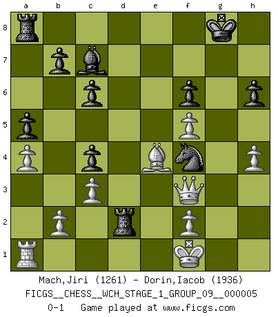 Last move : 0-1 2008 October 16 23:39:26 [Event "FICGS__CHESS__WCH_STAGE_1_GROUP_09__000005"] [Site "FICGS"] [Date "2008.07.08"] [Round "1"] [White "Mach,Jiri"] [Black "Dorin,Iacob"] [Result "0-1"] [WhiteElo "1261"] [BlackElo "1936"] 1.e4 e5 2.Nf3 Nc6 3.Bc4 Nf6 4.d3 Bc5 5.O-O O-O 6.c3 Bb6 7.Nbd2 d6 8.Bb3 h6 9.Nc4 Be6 10.Re1 Qd7 11.h3 Rfe8 12.Ba4 Bxc4 13.dxc4 Qe6 14.Qe2 Nd7 15.Nh4 Ne7 16.Bd2 Red8 17.Bc2 Qf6 18.g3 Qe6 19.Nf5 Nf6 20.Kg2 Nxf5 21.exf5 Qd7 22.a4 a5 23.Qf3 c6 24.g4 d5 25.Rxe5 Bc7 26.Re2 dxc4 27.h4 Qxd2 28.Rxd2 Rxd2 29.g5 Nd5 30.Be4 Nf4+ 31.Kf1 f6 32.gxf6 gxf6 0-1 This chess game has been lost on time (started : 2008.07.08 16:24:0) Two knights defense (Modern Bishop's Opening) Kingside Castling by player White (move 5) Kingside Castling by player Black (move 5) Player Black won this chess game. Follow this game move after move (download)Capture of the adverse King is the ultimate but not the first object of the game. (William Steinitz) Taktik ist was man tun muß, wenn etwas zu tun ist. Strategie ist was man tun muß, wenn nichts zu tun ist. (Savielly Grigorievitsch Tartakower) Del Ajedrez se ha dicho que la vida no es lo suficientemente larga para él, pero eso es culpa de la vida, no del Ajedrez. (William Ewart Napier) RxDa4 pat (...) When you have everything, sometimes it feels like nothing. (Horatio Caine, C.S.I. Miami)