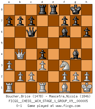 Last move : 0-1 2008 September 12 19:29:23 [Event "FICGS__CHESS__WCH_STAGE_1_GROUP_09__000005"] [Site "FICGS"] [Date "2008.07.08"] [Round "1"] [White "Boucher,Brice"] [Black "Mascetra,Nicola"] [Result "0-1"] [WhiteElo "1478"] [BlackElo "1846"] 1.e4 e5 2.Nf3 Nc6 3.Be2 Nf6 4.Nc3 d5 5.Nxd5 Nxd5 6.exd5 Qxd5 7.d3 Be7 8.O-O O-O 9.Kh1 Bf5 10.Be3 Rad8 11.Qc1 h6 12.a3 Bf6 13.Rd1 Rfe8 14.Qd2 Qe6 15.Qe1 Nd4 16.Bxd4 exd4 17.Bf1 Qc6 18.Qb4 Bg4 0-1 Inverted Hungarian Kingside Castling by player White (move 8) Kingside Castling by player Black (move 8) Player Black won this chess game. Follow this game move after move (download)The tactician knows what to do when there is something to do; whereas the strategian knows what to do when there is nothing to do. (Gerald Abrahams) Wie gewinnt Tal? Er entwickelt alle seine Figuren in die Brettmitte und opfert sie dann irgendwo. (Robert James Fischer) Un sacrificio se refuta mucho mejor al aceptarlo. (Wilhelm Steinitz) Les Echecs ont trois composantes : le temps, l'espace et le matériel en dernier. (Mikhail Tal) Perfection is achieved, not when there is nothing more to add, but when there is nothing left to take away. (Antoine de Saint-Exupéry)