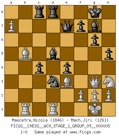Last move : 1-0 2008 October 17 12:7:5 [Event "FICGS__CHESS__WCH_STAGE_1_GROUP_09__000005"] [Site "FICGS"] [Date "2008.07.08"] [Round "1"] [White "Mascetra,Nicola"] [Black "Mach,Jiri"] [Result "1-0"] [WhiteElo "1846"] [BlackElo "1261"] 1.d4 Nf6 2.c4 c5 3.d5 b5 4.cxb5 a6 5.e3 g6 6.Nc3 Bg7 7.Nf3 O-O 8.Qb3 Qb6 9.a4 axb5 10.Bxb5 e6 11.e4 exd5 12.e5 Ne4 13.Nxe4 dxe4 14.Ng5 Bb7 15.O-O Nc6 16.Qh3 h5 17.Be3 Nxe5 18.Rac1 Rac8 19.b4 d6 20.bxc5 dxc5 21.Qg3 Rfd8 22.Rb1 Qd6 23.a5 Qe7 24.a6 Bd5 25.Rfd1 c4 26.a7 Nd3 27.Nh3 1-0 This chess game has been lost on time (started : 2008.07.08 16:24:0) Benko gambit half accepted Kingside Castling by player Black (move 7) Kingside Castling by player White (move 15) Player White won this chess game. Follow this game move after move (download)The game of Chess is not merely an idle amusement; several very valuable qualities of the mind are to be acquired and strengthened by it, so as to become habits ready on all occasions; for life is a kind of Chess. (Benjamin Franklin) Herr Iljumschinow ist ein etwas merkwürdiger Geschäftsmann: Er arbeitet zusammen mit Leuten wie Muammar al-Gaddafi; früher ist das Saddam Hussein gewesen. (Joel Lautier) Una de estas pequeñas movidas modestas pudieran ser mas molestas a tu oponente que la amenaza mas grande. (Siegbert Tarrasch) Le système Elo représente seulement une moyenne. Il est simplement un indicateur de votre stabilité. (Anatoli Karpov) The general who wins the battle makes many calculations in his temple before the battle is fought. The general who loses makes but few calculations beforehand. (Sun Tzu)