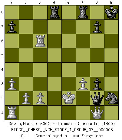 Last move : 0-1 2008 July 24 22:40:8 [Event "FICGS__CHESS__WCH_STAGE_1_GROUP_09__000005"] [Site "FICGS"] [Date "2008.07.08"] [Round "1"] [White "Davis,Mark"] [Black "Tommasi,Giancarlo"] [Result "0-1"] [WhiteElo "1600"] [BlackElo "1800"] 1.e4 Nf6 2.Nc3 e5 3.Nf3 Nc6 4.d4 exd4 5.Nxd4 Bb4 6.Nxc6 bxc6 7.Bd3 d5 8.exd5 cxd5 9.O-O O-O 10.Bg5 c6 11.Re1 Be6 12.a3 Bd6 13.Ne2 Bxh2+ 14.Kxh2 Ng4+ 15.Kg1 Qxg5 16.Ng3 Qh4 17.Kf1 f5 18.Rxe6 f4 19.Bxh7+ Kxh7 20.Qd3+ Kg8 21.Rxc6 fxg3 22.Qxd5+ Kh8 23.f3 Rad8 24.Qc5 Qh1+ 25.Qg1 Nh2+ 26.Ke2 Qxg2+ 0-1 Alekhine's defense Kingside Castling by player White (move 9) Kingside Castling by player Black (move 9) Player Black won this chess game. Follow this game move after move (download)Chess is in its essence a game, in its form an art, and in its execution a science. (Baron Tassilo) Gewinnen beim Schach fördert das Selbstvertrauen. Beim Sex spüre ich sowas nicht... (Garry Kasparov) El Ajedrez se juega con la mente... ¡no con las manos!. (Renaud y Kahn) Vouloir jouer aux échecs contre soi-même est aussi paradoxal que vouloir marcher sur son ombre. (Stefan Zweig) Watch your thoughts; they become words. Watch your words; they become actions. Watch your actions; they become habits. Watch your habits; they become character. Watch your character; it becomes your destiny. (Frank Outlaw)