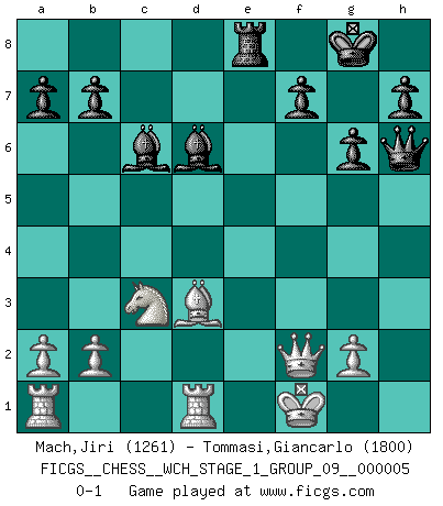 Last move : 0-1 2008 October 16 23:39:26 [Event "FICGS__CHESS__WCH_STAGE_1_GROUP_09__000005"] [Site "FICGS"] [Date "2008.07.08"] [Round "1"] [White "Mach,Jiri"] [Black "Tommasi,Giancarlo"] [Result "0-1"] [WhiteElo "1261"] [BlackElo "1800"] 1.e4 e5 2.Nf3 Nf6 3.d4 Nxe4 4.Bd3 d5 5.Nxe5 Nd7 6.Nxd7 Bxd7 7.O-O Bd6 8.c4 c6 9.cxd5 cxd5 10.Qh5 O-O 11.Qxd5 Bc6 12.Qh5 g6 13.Qh6 Re8 14.Nc3 Qb6 15.Rd1 Rac8 16.Bf4 Nxf2 17.Kxf2 Qxd4+ 18.Be3 Rxe3 19.Qxe3 Qh4+ 20.Kf1 Re8 21.Qf2 Qxh2 22.Qg1 Qf4+ 23.Qf2 Qh6 0-1 This chess game has been lost on time (started : 2008.07.08 16:24:0) Petrov : Modern attack, Symmetrical variation Kingside Castling by player White (move 7) Kingside Castling by player Black (move 10) Player Black won this chess game. Follow this game move after move (download)By this measure (on the gap between Fischer & his contemporaries), I consider him the greatest world champion. (Garry Kasparov) Wer mein Gambit spielt, muß bereit sein, alle Brücken hinter sich abzubrechen. Es verändert den ganzen Menschen. Es wirkt wie ein Zauberstab und fördert verkümmerte, gute Charakter- eigenschaften wieder zu Tage. (Emil Joseph Diemer) Cualquier cambio de material en una posición debe venir por medio de un mate, una captura o promoción de Peón. (Purdy) En blitz, le Cavalier l'emporte sur le Fou. (Vlastimil Hort) The modern world has divided itself into Conservatives and Progressives. The business of Progressives is to go on making mistakes. The business of the Conservatives is to prevent the mistakes from being corrected. (G.K. Chesterton)