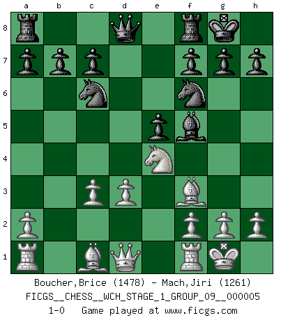 Last move : 1-0 2008 September 6 2:13:19 [Event "FICGS__CHESS__WCH_STAGE_1_GROUP_09__000005"] [Site "FICGS"] [Date "2008.07.08"] [Round "1"] [White "Boucher,Brice"] [Black "Mach,Jiri"] [Result "1-0"] [WhiteElo "1478"] [BlackElo "1261"] 1.e4 e5 2.Nf3 Nc6 3.Be2 Nf6 4.Nc3 Bb4 5.d3 d5 6.O-O Bxc3 7.bxc3 dxe4 8.Ng5 exd3 9.cxd3 O-O 10.Bf3 Bf5 11.Ne4 1-0 Inverted Hungarian Kingside Castling by player White (move 6) Kingside Castling by player Black (move 9) Player White won this chess game. Follow this game move after move (download)Let the perfectionist play postal. (Yasser Seirawan) Um sich vor der Gefahr einer Erkältung zu schützen, sorge der wanderlustige König beizeiten für ein brauchbares Versteck. (Aaron Nimzowitsch) Tu cuerpo tiene que estar en óptima condición. Tu Ajedrez se deteriora como lo hace tu cuerpo. No puedes separar la mente y el cuerpo. (Bobby Fischer) Aidez vos pièces, elles vous aideront. (Paul Morphy) There are three kinds of lies: lies, damned lies and statistics. (Mark Twain)