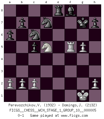 Last move : 0-1 2008 September 10 15:58:32 [Event "FICGS__CHESS__WCH_STAGE_1_GROUP_10__000005"] [Site "FICGS"] [Date "2008.07.08"] [Round "1"] [White "Perevozchikov,Vjacheslav"] [Black "Domingo,Jordi"] [Result "0-1"] [WhiteElo "1932"] [BlackElo "2132"] 1.e4 e5 2.Nf3 f5 3.Nxe5 Qf6 4.d4 d6 5.Nc4 fxe4 6.Nc3 Qg6 7.f3 exf3 8.Qxf3 Be7 9.Bd3 Qg4 10.Qxg4 Bxg4 11.Ne3 Be6 12.O-O Nf6 13.Nf5 Bxf5 14.Bxf5 Nc6 15.Be3 a6 16.Be6 Nd8 17.Bh3 O-O 18.Rae1 Nc6 19.Be6+ Kh8 20.g4 Nd8 21.Bf5 g6 22.Bh6 gxf5 23.Bxf8 Bxf8 24.Rxf5 Kg7 25.g5 Nd7 26.Re8 Rb8 27.Nd5 c5 28.dxc5 dxc5 29.Nc7 Nc6 30.Nd5 Rxe8 0-1 Latvian counter-gambit Kingside Castling by player White (move 12) Kingside Castling by player Black (move 17) Player Black won this chess game. Follow this game move after move (download)The passion for playing Chess is one of the most unaccountable in the world. (H.G. Wells) Sie bekommen vielleicht den Eindruck, dass die Spitzenspieler überhaupt gar nicht so stark sind. Aber das stimmt nicht. Es ist eine Illusion. Mit einem Computer an der Seite ist es sehr leicht, Urteile zu fällen, aber wenn man alleine am Brett sitzt, sieht die Sache ganz anders aus. (Vladimir Kramnik) Debió haber existido una vez en que los hombres eran semidióses, de otra manera no hubiesen podido inventar el Ajedrez. (Gustav Schenk) Mais n'est-ce pas déjà le limiter injurieusement que d'appeler les échecs un jeu? N'est-ce pas aussi une science, un art, ou quelque chose qui, comme le cercueil de Mahomet entre ciel et terre, est suspendu entre l'un et l'autre, et qui réunit un nombre incroyable de contraires ? (Stefan Zweig) If only faces could talk... (Pat Summerall, Sportscaster during the Super Bowl)
