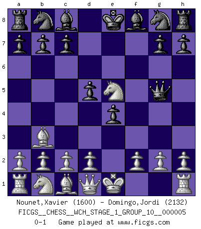 Last move : 0-1 2008 August 18 6:22:13 [Event "FICGS__CHESS__WCH_STAGE_1_GROUP_10__000005"] [Site "FICGS"] [Date "2008.07.08"] [Round "1"] [White "Nounet,Xavier"] [Black "Domingo,Jordi"] [Result "0-1"] [WhiteElo "1600"] [BlackElo "2132"] 1.e4 e5 2.Nf3 f5 3.Bc4 fxe4 4.Nxe5 d5 5.Bb3 Qg5 0-1 This chess game has been lost on time (started : 2008.07.08 16:25:19) Latvian : Polerio variation Player Black won this chess game. Follow this game move after move (download)Chess, like any creative activity, can exist only through the combined efforts of those who have creative talent, and those who have the ability to organize their creative work. (Mikhail Botvinnik) Frage des Reporters: -Welche besonderen Umstände rechtfertigen das Anhalten der Uhren während einer Turnierpartie? Antwort: -Einen Fotographen zu strangulieren. (Siegbert Tarrasch) Prefiero perder una partida realmente buena, que ganar una mala. (David Levy) Toutes les manuvres exécutées sur une colonne ouverte ont pour but ultime l'intrusion définitive sur la septième ou la huitième rangée, en plein cur de la position ennemie. (Aaron Nimzovitch) There's no money in correspondence chess. (John Knudsen)