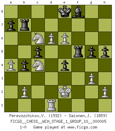 Last move : 1-0 2008 August 15 16:19:20 [Event "FICGS__CHESS__WCH_STAGE_1_GROUP_10__000005"] [Site "FICGS"] [Date "2008.07.08"] [Round "1"] [White "Perevozchikov,Vjacheslav"] [Black "Salonen,Jukka"] [Result "1-0"] [WhiteElo "1932"] [BlackElo "1859"] 1.d4 d5 2.c4 e6 3.Nf3 Nf6 4.g3 dxc4 5.Bg2 b5 6.a4 b4 7.Ne5 Nd5 8.e4 Nf6 9.Nxc4 Bb7 10.Bg5 Nc6 11.e5 h6 12.Be3 Nd5 13.Nbd2 Na5 14.Nxa5 Nxe3 15.Nxb7 Nxg2+ 16.Kf1 Qd5 17.Qf3 Ne3+ 18.fxe3 Rb8 19.Qxd5 exd5 20.Na5 c5 21.e4 dxe4 22.d5 f5 23.Nc6 Rb7 24.Ke2 h5 25.Nc4 Rh7 26.e6 Rh6 27.Rad1 g5 28.Rhf1 Rf6 29.Rxf5 Rxf5 30.d6 1-0 Queen's gambit declined Player White won this chess game. Follow this game move after move (download)I know people who have all the will in the world, but still can't play good Chess. (Bobby Fischer) Ich moechte nie einem Club beitreten, der Leute wie mich als Mitglieder aufnimmt. (Woody Allen) Una clavada es mas poderosa que una espada. (Fred Reinfeld) Le succès, c'est être capable d'aller d'échec en échec sans perdre son enthousiasme. (Winston Churchill) I take risks, sometimes patients die, but not taking risks causes more patients to die. So I guess my biggest problem is I've been cursed with the ability to do the math. (Gregory House, House M.D.)