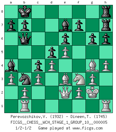 Last move : 1/2-1/2 2008 September 11 17:5:52 [Event "FICGS__CHESS__WCH_STAGE_1_GROUP_10__000005"] [Site "FICGS"] [Date "2008.07.08"] [Round "1"] [White "Perevozchikov,Vjacheslav"] [Black "Dineen,Thomas"] [Result "1/2-1/2"] [WhiteElo "1932"] [BlackElo "1745"] 1.e4 e6 2.d4 d5 3.e5 c5 4.c3 Nc6 5.Nf3 Qb6 6.a3 c4 7.Nbd2 Na5 8.Be2 Bd7 9.O-O Ne7 10.Rb1 Qc7 11.Ng5 h6 12.Nh3 O-O-O 13.Nf4 Nf5 14.Nh5 g6 15.Nf6 Bc6 16.Bg4 Be7 17.Re1 Kb8 18.Nf3 Ng7 19.Qe2 Ne8 20.Nxe8 Rdxe8 21.h4 Nb3 22.Be3 Reg8 23.g3 Ba4 24.Kg2 Rg7 25.Rh1 Rgh7 26.Rh2 Qb6 27.R2h1 1/2-1/2 French : Advance, Paulsen attack Kingside Castling by player White (move 9) Queenside Castling by player Black (move 12) This chess game ended in a draw. Follow this game move after move (download)When you don't know what to do, wait for your opponent to get an idea - it's sure to be wrong. (Tarrasch) Ich glaube, ich kenne inzwischen die Gründe für mein Versagen: schachliche Charakterfehler. Ich war nie ein Wunderkind und in meiner gesamten menschlichen Entwicklung immer zu langsam. (Viktor Kortschnoi) Creo que una cierta cantidad de temperamento es esperada de los genios del Ajedrez. (Ron Gross) Karpov est une pièce de musée. (Garry Kasparov) I find television to be very educating. Every time somebody turns on the set, I go in the other room and read a book. (Groucho Marx)