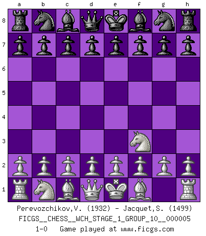 Last move : 1-0 2008 August 9 5:24:21 [Event "FICGS__CHESS__WCH_STAGE_1_GROUP_10__000005"] [Site "FICGS"] [Date "2008.07.08"] [Round "1"] [White "Perevozchikov,Vjacheslav"] [Black "Jacquet,Stephane"] [Result "1-0"] [WhiteElo "1932"] [BlackElo "1499"] 1.Nf3 1-0 This chess game has been lost on time (started : 2008.07.08 16:25:19) Reti Opening Player White won this chess game. Follow this game move after move (download)It is not a move, even the best move that you must seek, but a realizable plan. (Eugene Znosko-Borovsky) Kasparov ist eine Art Monster mit hundert Augen, denen auch nicht das Geringste entgeht. (Tony Miles) Todos los Maestros de Ajedrez fueron un día unos principiantes. (Chernev) L'action d'une oeuvre littéraire se déroule sur un champ de bataille. Les masques et les types du drame moderne correspondent aux pièces du jeu d'échecs. L'intrigue correspond aux coups et aux gambits, c'est à dire aux techniques du jeu telles qu'utilisées et interprétées par les joueurs. Les tactiques et les péripéties [mouvements] correspondent aux coups exécutés par l'adversaire. (Viktor Shklovsky) A good programmer is someone who always looks both ways before crossing a one-way street. (Doug Linder)