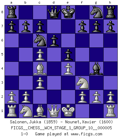Last move : 1-0 2008 August 18 6:22:13 [Event "FICGS__CHESS__WCH_STAGE_1_GROUP_10__000005"] [Site "FICGS"] [Date "2008.07.08"] [Round "1"] [White "Salonen,Jukka"] [Black "Nounet,Xavier"] [Result "1-0"] [WhiteElo "1859"] [BlackElo "1600"] 1.e4 e5 2.Nf3 Nc6 3.Bc4 Bc5 4.c3 d6 5.d4 Bg4 6.dxc5 1-0 This chess game has been lost on time (started : 2008.07.08 16:25:19) Giuoco Piano Player White won this chess game. Follow this game move after move (download)Many have become Chess Masters, no one has become the Master of Chess. (Siegbert Tarrasch) Stelle das Brett so, daß die Sonne in die Augen deines Gegners scheint. (Ruy López) Yo siempre he tenido un ligero sentimiento de lástima por una persona que no tiene conocimiento del Ajedrez. (Siegbert Tarrasch) Des points faibles ou des trous dans la position de l'adversaire doivent être occupés par des pièces et non pas par des pions. (Siegbert Tarrasch) They say in chess you've got to kill the queen, and then you mate it... Oh I, do you ? (Red Hot Chili Peppers, Fortune faded)