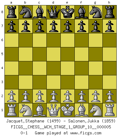 Last move : 0-1 2008 August 7 17:16:17 [Event "FICGS__CHESS__WCH_STAGE_1_GROUP_10__000005"] [Site "FICGS"] [Date "2008.07.08"] [Round "1"] [White "Jacquet,Stephane"] [Black "Salonen,Jukka"] [Result "0-1"] [WhiteElo "1499"] [BlackElo "1859"] 0-1 This chess game has been lost on time (started : 2008.07.08 16:25:19) Player Black won this chess game. Follow this game move after move (download)I believe that Chess possesses a magic that is also a help in advanced age. A rheumatic knee is forgotten during a game of Chess and other events can seem quite unimportant in comparison with a catastrophe on the chessboard. (Vlastimil Hort) Frage: Wie viele Autos haben Sie schon zerstört? - Antwort: Nur zwei. (Loek van Wely) Muchos jugadores de Ajedrez se sorprendían cuando después de la partida, Fischer explicaba con calma: 'Yo ya había analizado esta posibilidad' en una posición en la cual yo creía que no era posible de prever desde la apertura. (Mikhail Tal) Un journaliste : 'Vous préférez avoir une dame de plus sur l'échiquier ou au lit ?' Boris Spassky : 'Ca dépend de la position.' If we don't succeed, we run the risk of failure. (George W. Bush)